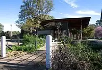 Work was completed on the Living Kaurna Cultural Centre by early September, 2002,[28] and it was officially opened later that month by representatives of the Kaurna people, the Marion Council Mayor, and local federal parliamentarian, Andrew Southcott.[29] The building was designed by Phillips/Pilkington Architects Pty Ltd and Habitable Places, and features a corrugated iron roof modeled to resemble the sweep of an ibis' wings, drawing a direction connection to the Tjilbruke Dreaming. The building incorporates an art gallery, a café, a retail area and a large stage, and the centre is used for education, cultural events, and retail sales of aboriginal and related produce.[23][28]