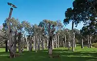 Located on the site is Tjilbruke narna arra, Tjilbruke Gateway, a representation of the Tjilbruke Dreaming by artists Sherry Rankine, Margaret Worth and Gavin Malone.[30] Commissioned by the City of Marion, the work consists of a number of tree trunks clustered together, interwoven with symbolic representations of aspects from the Dreaming. Amongst these symbols are a number of circles around selected trunks, representing the freshwater springs that were created by Tjilbruke's tears; flows of coloured sands running through the work to represent the gully winds and the "flow of the river and of life"; and a representation of an ibis positioned above iron pyrite, symbolising Tjilbruke's final transformation.[1][3] The work was intended, amongst other aims, to provide a space in which the Dreaming stories could be related by members of the Kaurna people.[30]