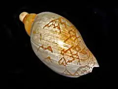 Shells of Livonia mammilla can reach a size of 100–303 millimetres (3.9–11.9 in).[3] These large shells are characterized by a greatly swollen apex and a lightweight protoconch with a diameter of about 20 millimetres (0.79 in). Whorls are smooth and rounded, with axial growth lines and weak spiral grooves on the top of the body whorl. Columella shows four plaits and the outer lip is smooth and flared outwards. The background colour is yellowish-brown or cream, while the inner edge of outer lip may be white or orange. Body whorl usually has two wide spiral bands of axial zigzag brown lines, but this pattern is variable.[5]