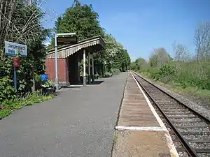The station passed into the ownership of the London, Midland and Scottish Railway at the 1923 Grouping, then to the Western Region of British Railways upon nationalisation in January 1948. The station was host to a LMS caravan from 1934 to 1939.[2] It was threatened with closure (along with the line) in 1962 and again in 1967, but survived on each occasion. It did however lose both its goods handling facilities and station staff in the summer of 1964, when through freight traffic ended and passenger services were converted to diesel operation. The main building remained intact (though in an increasingly dilapidated state) until 1980, when it was finally demolished and replaced by a basic wooden shelter. This in turn was replaced by the current (more substantial) structure in 1998.[1]