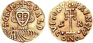 In 774, still under Arechis, the duchy was transformed into a principality and the new legend "PRINPI" appeared on the reverse of the coins. The type, with some minor variations in the tunic, was also used under Grimoald III and until the end of the gold coinage of Benevento.[27] With Grimoald III the legend with the prince's name written in full was used for the first time: previously there was only the initial of the duke's name on the reverse, with or without the indication of the title, expressed either with the letter D or with a monogram (ɵV for dvx). Grimoald's coinage is divided into two periods that testify to changes in the foreign policy of the principality.[28][29][30] Grimoald obtained permission from Charlemagne, who had become rex Francorum et Langobardorum, to reenter the principality and assume its crown, though he undertook to mint coinage and issue documents exclusively in Charlemagne's name and to require the Lombards to wear their chins shaved in accordance with Frankish custom.[31]