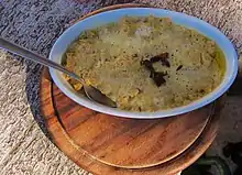 A renowned soup based on Lombardy's agricultural products is minestrone alla milanese, obtained by boiling the main vegetables growing in the region and flavored with lard and pork rinds.[12] Other dishes of the poor tradition are the zuppa alla pavese, a soup made with broth, stale bread, eggs and grated cheese, and the pancotto, stale bread soaked in water, cooked in a pot together with butter and with the addition of meat, cooked in the whole region: a sort of "summation" of the two dishes is constituted by the minestra mariconda bresciana, obtained by adding to the previous ingredients also some cow's milk. In Brianza can also be found urgiada, a soup of barley with bacon, leeks and beans.