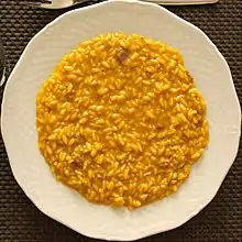 Rice is a common element to all the local cuisines of Lombardy, and represents the base of first courses from Valtellina to Mantovano: Lombardy is responsible for 42% of the whole Italian rice production. The "basic" rice preparation common to the whole region is rice in cagnone, rice boiled in salted water and seasoned with butter in which garlic and sage have been sautéed, and finally sprinkled with Grana cheese. It can also be served with asparagus or pumpkin.[8] Besides this there are also soups prepared with rice, combined with typical vegetables of the whole region, such as cabbage, turnip, peas and coratella. The main dish of the region are risotti, rice toasted and then cooked with hot broth: common in the whole Lombardy territory are risotto with mushrooms, and with sausage.[9]
