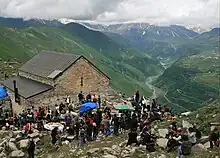 The Lomisa church hosts an annual festival, known as Lomisoba (literally, "of/related to Lomisa"), probably a remnant of an ancient pre-Christian cult superimposed by the veneration of St. George. Every year, on the Wednesday after Pentecost,[9] thousands of people from various regions of Georgia, especially Mtiuleti, Khevi, and Khevsureti, make a pilgrimage up to the Lomisa church. There are specific rituals for healing the sick and for seeking fertility for childless women. There is a round dance performed, with a song that describes the legend of the heavy chain that hangs in the church and is worn by pilgrims.[9] The festival also features a large-scale ritual animal sacrifice, in which hundreds of livestock, especially sheep, are slaughtered down in the valley, not far from the church. In the 2010s, the tradition has been increasingly criticized by animal rights activists, but the locals have rejected the calls to abandon it. The Georgian Orthodox clergy have stated that the Church "prefers unbloody sacrifice" but does not forbid the tradition of animal killing and concomitant supra (feast).[10][11]
