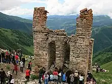 The Lomisa church (Georgian: ლომისა) is a medieval Christian shrine in eastern Georgia, dedicated to Saint George. It is a simple stone hall church built in the 9th or 10th century. Located at about 2,200 m (7,218 ft) above sea level on a mountain ridge—the watershed between the Ksani and Aragvi valleys—Lomisa is the principal shrine for the highland province of Mtiuleti and neighboring communities as well as the scene of an annual festival on the Wednesday after Pentecost, which features a mass sacrificial slaughter of animals. Due to its historic and cultural significance, the church is inscribed on the list of Georgia's Immovable Cultural Monuments of National Significance.[1]
