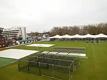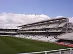 Purchased in two parts by the MCC in 1838 and 1887, the ground is primarily used as a practice ground and is considered to have some of the best grass nets in the world.[118] In 1895 the Middlesex Volunteers requested the use of the Nursery Ground as a drill ground, but this was declined by the MCC.[119] The Nursery Pavilion, which was constructed in 1999, overlooks the playing area of the Nursery Ground and is one of London's largest venues.[120] The ground has hosted one first-class cricket match in 1903, when the MCC played Yorkshire;[121] the match was originally to be played on the main Lord's ground, but heavy rain had fallen and in the week leading up to the match this had led to the abandonment of a match between the MCC and Nottinghamshire. The heavy rain persisted during the MCC v Yorkshire match, with the players spending the first two days of the three-day match sat in the pavilion. However, it was deemed that the playing surface on the Nursery Ground was suitable for the third day of the match to be played there,[122] with both sides batting for an innings each and Yorkshire's Wilfred Rhodes making an unbeaten 98.[123]