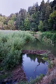 Between Lake Elsman and Lexington Reservoir, the creek is pristine and closed to the public. Here, along with rainbow trout, beaver, bobcats (Lynx rufus), wild boar (Sus scrofa) and puma (Puma concolor) are extant. The beaver were restocked to the portion of Los Gatos Creek where it enters Lexington Reservoir sometime before spring 1992, and recently, a beaver reportedly served as "a hearty meal" for a local mountain lion.[15] Historical evidence of beaver in the area includes reference by Captain John Sutter who around 1840 recorded that 1,500 beaver pelts were sold "at a trifling value" by the Indians to Mission San José, the latter only 25 miles from the town of Los Gatos.[16] Physical proof of golden beaver in south San Francisco Bay tributaries is a Castor canadensis subauratus skull in the Smithsonian Institution National Museum of Natural History collected by zoologist James Graham Cooper in Santa Clara, California on Dec. 31, 1855.[17] Cooper lived in Mountain View, California from October to December 1855 and collected most of his specimens on Saratoga Creek (then "Quito Creek").[18]