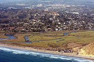 Los Peñasquitos Marsh Natural Preserve and Lagoon is a coastal marsh in San Diego County, California, United States situated at the northern edge of the City of San Diego, forming the natural border with Del Mar, California.[1] This bar-built estuary (a lagoon separated from the ocean by a mouth bar, a typical estuary for California[2]), previously called The Soledad Lagoon, divides a colony of the endangered Pinus torreyana on a narrow coastal strip.[3] Three streams empty into the lagoon: Carroll Creek, Carmel Creek (also known as the Carmel Valley Creek), Los Peñasquitos Creek with a total drainage basin area of 95 square miles.[4]