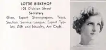 Lottie Riekehof was born 1920 in Germany to Henry and Laura Riekehof, and was the oldest of four children.[4] In 1923, Riekehof, with her parents and younger sister, Ruth, immigrated from Lage, North Rhine-Westphalia to Elizabeth, New Jersey.[5] After settling, her two younger brothers Henry and Paul were born.[4][6]