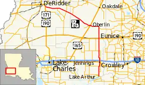 In the original Louisiana Highway system in use prior to 1955, LA 26 was part of two different routes. The east–west section from DeRidder to Oberlin made up the entirety of State Route 52.[10][11] The north–south section from Oberlin to Lake Arthur was part of State Route 25,[11][12] a long U-shaped route that continued east along the present LA 14 to New Iberia then north along LA 31 to Opelousas.[13] Both Routes 25 and 52 were included in the first 98 state highway routes designated by the Louisiana Legislature in 1921 as part of an act which also created the Louisiana Highway Commission, an early forerunner of the Louisiana Department of Transportation and Development (La DOTD).[14] Additionally, the stretch between DeRidder and Elton served briefly as part of US 190 when that highway was extended westward from Baton Rouge in 1935.[15][16] However, the roadway was still gravel west of Oberlin and dirt from Oberlin to Elton. In the late 1930s, US 190 was shifted twice to take advantage of paved roadways in the area. It was ultimately routed via US 171 from DeRidder south to Ragley and what was then State Route 7 through Kinder, eliminating the longest stretch of the unpaved roadway on US 190 within the state.[17][18]