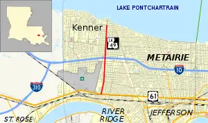 The route serves as the principal north–south thoroughfare of the city of Kenner, a suburb of New Orleans, and is lined almost continuously with shopping centers, eating establishments, and other commercial services. It is also heavily traveled due to its proximity to Louis Armstrong New Orleans International Airport, and it intersects many of the major east–west routes through neighboring Metairie, including Interstate 10 (I-10), Airline Drive (US 61), West Metairie Avenue, Veterans Memorial Boulevard, and West Esplanade Avenue.