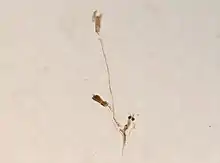 Lovenella gracilis are colonial animals that form erect colonies,[1] on hard surfaces using a hydrorhiza, stem-like structure, and reach a maximum height of around 2.3 mm.[2] The polyp is the dominant stage of the L. gracilis. They are trophosome with thin hydrocaulus that branch out alternatively to form the hydrotheca. At the end of each branch there is a conical operculum that consists of eight pieces. This structure also contains ten to twelve tentacles equipped with nematocysts that can be used in self-defense or to capture their prey.[3]