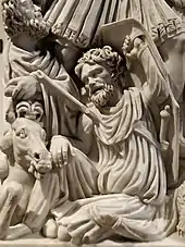 The central figure of the tortuous composition on the front is a young Roman military commander on horseback, presumed to represent the deceased. His face is serene, and his arm is extended confidently in a "gesture which is difficult to interpret but seems to be one of farewell".[8] He does not hold any weapon and is bareheaded, unlike the other Roman soldiers. This implies that he does not need any protection or weaponry to win the battle.[1] An X-mark on his forehead has been interpreted as the cross received by initiates into the Mithraic mysteries as a sign of the god Mithras' favor. The Mithraic religion was popular among Roman soldiers. The valor (virtus) shown by the horseman may represent real-life bravery on the battlefield, but the religious connotation of the X may suggest victory over death, a theme of mounted warriors in funerary art.[9] It could also have marked the figure as the "savior of humanity, the bringer of light to a world of tumult, and the guarantor of eternity."[1]