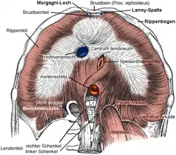 ![]() The diaphragm. Under surface. (Lumbocostal triangle not labeled, but costal and lumbar regions are visible) | |