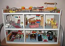 The 'Economy' house dates back to the late 1960s. At the tail end of the 1960s, Lundby adapted the Göteborg design to create a cheaper, unelectrified house with wider market appeal, called the 'Economy' house. The number of rooms were the same as the Göteborg but reversed; so the ground floor had two and the first floor three rooms. Gone was the funky wallpaper and a more neutral look was adopted.