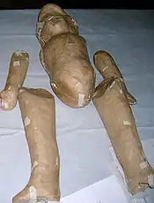 A Lupita doll is a kind of papier-mâché doll which was made primarily by the poor along with those from straw, wood and rags.[1] The papier-mâché technique is properly called cartonería, making a very hard surface when dry. This technique has been used to make a number of crafts up to this day, most notably to make alebrijes and skeletal and other figures for Day of the Dead.[2] The dolls are usually created with the help of molds, one for the head and torso and others for the arms and legs, with the strips of paper and paste layered on thickly. When the five pieces are dry, holes are bored into them in order to connect the arms and legs. The two arms are connected to the body with a single cord that extends from one upper arm, through the torso, to the other upper arm, with knots visible on the upper arms. The legs are attached similarly. This allows the arms and legs to be moved from the shoulders and hips respectively. Traditional Lupitas are painted in various flesh tones and with other colors to simulate clothing or underwear. On traditional dolls, flower designs of Otomi origin are also painted. Those painted with underwear are then dressed in some kind of costume.[2][3]
