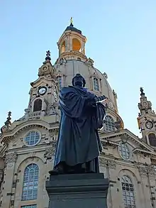 Artists who designed Lutheran Baroque art not only took their inspiration from Martin Luther, but from popular Lutheran piety in the latter part of the 16th and 17th centuries.[23] The Dresden Frauenkirche serves as a prominent example of Lutheran Baroque art, which was completed in 1743 after being commissioned by the Lutheran city council of Dresden:[24]