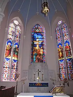 With respect to the Divine Service, "Lutheran worship became a complex ritual choreography set in a richly furnished church interior."[15] Ornate church interiors in Lutheran churches reflected Lutheran Eucharistic theology, which taught the real presence of Christ in the Eucharist as a sacramental union.[1] Lutheran churches, as well as homes, displayed a prominent crucifix as it highlighted their high view of the Theology of the Cross.[1][16][17] It became a popular devotional image for Lutherans, who "prayed, meditated, and even wept before them."[17] Thus, for Lutherans, "the Reformation renewed rather than removed the religious image."[18]