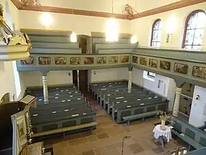 Martin Luther encouraged the display of some religious imagery in churches, seeing the Evangelical Lutheran Church as a continuation of the "ancient, apostolic church".[1] He defended the use of "importance of images as tools for instruction and aids to devotion",[2] stating that "If it is not a sin but good to have the image of Christ in my heart, why should it be a sin to have it in my eyes?"[3]