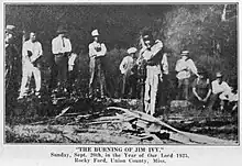 After Ivy was completely burned on the pyre, the mob left, and many complained that they would have to go to New Albany to eat, since the crowd had eaten all the food locally.[5] Sheriff Roberts stated he expected no further violence, and claimed that he did not recognize any members of the mob.[11] The mob was so confident that they would not face any repercussions for their actions, they made no attempt to conceal their identities, and even posed for pictures.[12][5]