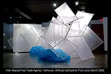 Art critic Amy Karlinsky, writing in BorderCrossings, opined that Richardson's "minimal and collapsible" Red State "hinted at her capacity to generate metaphor": its "monumentality" was "all sham and seductive illusion a tidy reference to both art and politics". And Karlinsky had earlier enjoyed "Richardson's fabulous and funny kinetic sculptures of 2002", which in her view "invited viewer participation and provided wry commentary on Canadian icons and symbolism".[2] But Karlinsky found Inter-Glacial Free Trade Agency.ca "more fraught" by contrast, and agreed with the exhibition curator that Richardson's environmental concerns were integral to her works and had "catalyzed" her into production. How, she wondered, did you suggest something as vast as the Arctic? "A simulated and disjointed landscape confronts the viewer. It is a depopulated, dystopic scenario" with strange artistic details. "Much is eerie, evocative and otherworldly."[2]