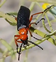 Typically 16 to 33 mm (0.6 to 1.3 in) in length, L. magister has a striking red head, legs and prothorax, with black elytra. They can be found in great numbers in the Mojave and Colorado Deserts in spring, and are often seen in swarms.[1] Females lay eggs in holes in the desert soil. The larvae are insectivorous, mainly attacking bee nests.[2] They consume the immature host along with its provisions, and can often survive on the provisions alone, thus they are not obligatory parasitoids but rather food parasites that are facultatively parasitoid, or simply predatory. Adults feed on flowers and leaves of brittlebush. Though they are not venomous, they can in fact bite.[1]