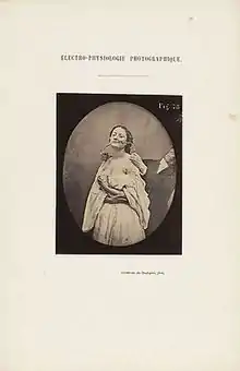 Whereas the scientific section was intended to exhibit the expressive lines of the face and the "truth of the expression", the aesthetic section was intended also to demonstrate that the "gesture and the pose together contribute to the expression; the trunk and the limbs must be photographed with as much care as the face so as to form an harmonious whole".[11] For these plates Duchenne used a partially blind young woman who he claimed "had become accustomed to the unpleasant sensation of this treatment …".[12] As in many of the plates for the scientific section, this model was also stimulated faradically to provoke a different expression on either side of her face. Duchenne advised that looking at both sides of the face simultaneously would reveal only a "mere grimace" and he urged the reader to examine each side separately and with care.