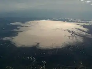 Mýrdalsjökull (pronounced [ˈmirˌtalsˌjœːkʏtl̥] , Icelandic for "(the) mire dale glacier" or "(the) mire valley glacier") is an ice cap in the south of Iceland. It is to the north of Vík í Mýrdal and to the east of the smaller ice cap Eyjafjallajökull. Between these two glaciers is Fimmvörðuháls pass. Its peak reaches 1,493 m (4,898 ft) in height and in the year 1980 it covered an area of approximately 595 km2 (230 sq mi).