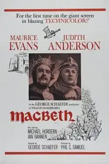 Macbeth is a 1960 television film adaptation of the William Shakespeare play presented as the November 20, 1960 episode of the American anthology series Hallmark Hall of Fame. The series' second production of the play was, like the 1954 live telecast, also directed by George Schaefer, and again starred English-born American actor Maurice Evans and Australian actress Judith Anderson. The supporting cast, however, was different, consisting entirely of British actors, and was filmed on location in Scotland; the 1954 version had used a mostly American cast.