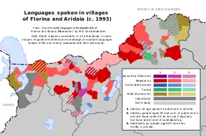 - 1 2 3 Van Boeschoten, Riki (1 May 2005). "Usage des langues minoritaires dans les départements de Florina et d'Aridea (Macédoine)" [Use of minority languages in the regions of Florina and Aridea (Macedonia)]. Strates (in French). Strates — Matériaux pour la recherche en sciences sociales (10). doi:10.4000/strates.381. ISSN 0768-8067. S2CID 161802924. Retrieved 16 February 2019.
