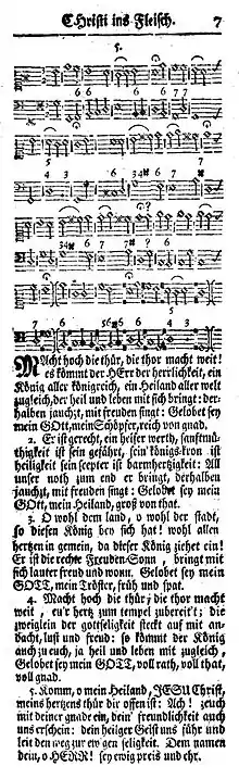 "Macht hoch die Tür" appears as number 1 in the current German Protestant hymnal Evangelisches Gesangbuch (EG 1).[2][3] It is also part of the Catholic hymnal Gotteslob (GL 218),[4] and published in 62 hymnals.[5] In the second half of the 20th century it was also included in several collections of Christmas carols beyond church usage.[1]