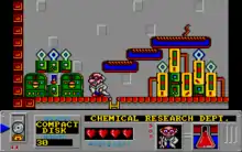 The five laboratories are Biological Observations, Chemical Research Dept., Computer Laboratory, Spacerocket Development and Central Power Control. The first four laboratories may be visited in any order; Central Power Control becomes accessible once the other four have been closed down. The Amiga and Archimedes versions combine horizontal scrolling with vertical flip-screen. The Atari ST version uses flip-screen in both directions.
