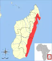 The Madagascar sucker-footed bat, Old World sucker-footed bat, or simply sucker-footed bat (Myzopoda aurita) is a species of bat in the family Myzopodidae endemic to Madagascar, especially in the eastern part of the forests.[2] The genus was thought to be monospecific until a second species, Myzopoda schliemanni, was discovered in the central western lowlands.[3] It was classified as Vulnerable in the 1996 IUCN Red List of Threatened Species but is now known to be more abundant and was reclassified in 2008 as of "Least Concern".[1]