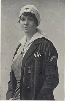At the outbreak of the war the Hancocks were living in England and was determined to volunteer as a nurse in Belgium.[6] She travelled to Antwerp to work with a British hospital unit in the city and remained with the hospital through the siege of the city until the hospital was evacuated in October 1914.[7] After a brief period with American Red Cross Hospital No. 1 (aka American Ambulance) in Neuilly,[8] Hancock returned to serve with a hospital nearer the front lines. For the next four years she worked almost ceaselessly in front-line hospitals and her activities and letters home were often reported in American newspapers, an opportunity Hancock used to ask for relief funds.[9] Her plea was answered and many gifts sent including a consignment of 60,000 packets of cigarettes donated by Asheville Fire Department.[10]