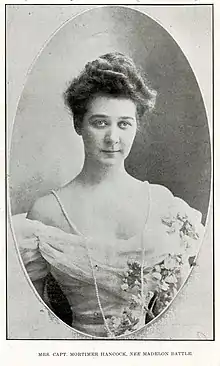 In 1904 she married Captain Mortimer Pawson Hancock, a British army officer, at All Souls Church in Biltmore Village.[5] The Atlanta Constitution described the ceremony as "the most distinguished wedding celebrated in North Carolina for a number of years".[5] After her marriage she moved to England and India with her husband. They had one son, Westray Battle Hancock, born 1907.