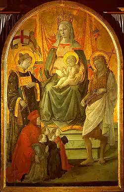 In the centre, the Madonna and Child are flanked by Saints Stephen and John the Baptist; below, Francesco Datini presents to the Virgin the four Buonomini ("Honourable Men") of the Ceppo: Andrea di Giovanni Bertelli, Filippo Manassei, Pietro Pugliesi and Jacopo degli Obizzi.