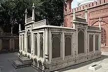 An enclosure at the southern side houses the tomb of Ghaziuddin Khan, who was buried in the complex following his death in 1710. The structure is a double enclosure of jali screens, with the outer one made of sandstone and the inner one made of marble. Its form is similar to those of tombs used for the burial of Mughal royals during this time period.[2][1]
