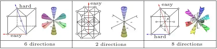 If the second term can be neglected, the easy axes are the ⟨100⟩ axes (i.e., the ± x, ± y, and ± z, directions) for K1 > 0 and the ⟨111⟩ directions for K1 < 0 (see images on right).