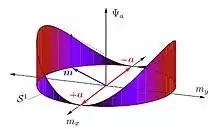 Uniaxial anisotropy energy plotted for 2D case. The magnetization direction is constrained to vary on a circle and the energy takes different values with the minima indicated by the vectors in red.