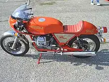 Magni wanted to produce an "all Italian" machine and turned to Moto Guzzi for a supply of engines. The first Guzzi engined machine was the Magni-Guzzi LeMans 1000, using the engine from the Le Mans 1000. A new frame was designed, which had similarities to the Lino Tonti designed Moto Guzzi item. Magni introduced the "parallelogram" rear suspension,[33] previously used on the 1950 shaft drive MV Agusta 500 cc GP machines,[35] which negated the torque reactions of the shaft drive and made the handing more predictable.[30][36] (A parallelogram kit was made available to upgrade the rear suspension of Moto Guzzi models)[37]