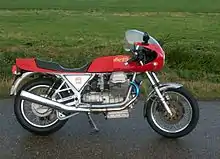 In 1989, Magni introduced the Sfida 1000 (Sfida being Italian for "challenge").[39] The machine continued the use of the Guzzi Le Mans 1000 engine and was styled to reflect the Italian MV and Gilera racing machines of the 1960s. The machines were fitted with a hand-beaten aluminium fuel tank,[1] a humped racing seat and a half-fairing.[40] Around 58 Sfida 1000 models were produced.[41]
