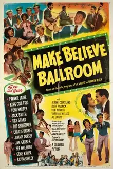 Make Believe Ballroom is a 1949 American musical romantic comedy directed by Joseph Santley and produced by Ted Richmond.[1] It was loosely based on a radio program of the same name by Martin Block and Al Jarvis. The film starred Jerome Courtland, Ruth Warrick, Ron Randell, Virginia Welles, and Jarvis.[2]