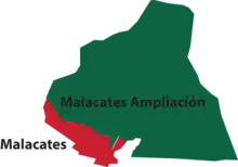 The original Malacates neighborhood is much smaller and more southern, bordering Colonias Lomas de Cuautepec and Parque Metropolitano to the south, Colonia Verónica Castro to the east, and La Ponderosa section of the Sierra de Guadalupe to the west.