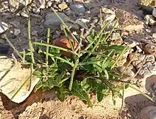 It is an annual herb growing in a prostrate patch or clump with stiff, furry stems up to half a meter long. The mustardlike flowers are pink to lavender and yield siliques up to 6 centimeters long.