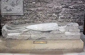 Malise is believed to have died in 1271, while in France. His body was brought back to Scotland, and he was buried at Dunblane Cathedral, the religious centre of Strathearn.[3] In 1817, during reconstruction of Dunblane Cathedral, two sarcophagi were discovered with life-size effigies of a warrior and his lady. Since the fourteenth-century chronicler John of Fordun had recorded Dunblane as the burial site of Malise, these were determined to be the tombs of Malise and his countess, though which one is uncertain. It was marked with the date 1271. In addition, Sir Robert Sibbald once mentioned that in the late 17th century, there was a picture in the church which represented the Countess of Strathearn and her children kneeling for a blessing to St. Blane, though its whereabouts today are unknown.[4]
