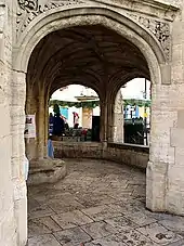 The market cross stands in the centre of the town, at the north end of the High Street. It was built c. 1490,[1] possibly using limestone salvaged from the recently ruined part of Malmesbury Abbey, which then began just across the market square from the cross. An elaborately carved octagonal structure of the Perpendicular Period, it is recognised as one of the best preserved of its kind in England, and was made a Grade I listed building in 1949.[2] A carving in relief of the Crucifixion and figures of several saints have survived the Reformation on the open lantern, although the lower niches for figures are now empty. Inside there is a lierne vaulted roof with carved bosses, springing from a central column with stone seating around it.[2] There is a low wall or bench across all the outside arches except two. The building is over 40 ft. high,[3] and today is nicknamed "the Birdcage", because of its appearance, and still serves to shelter market traders by day and as a meeting point at night.[4]
