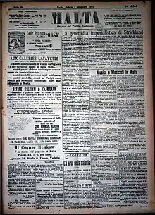 In the 1920s and 1930s, the Malta, led by Enrico Mizzi, son of Fortunato, was the press outlet of the Italophiles Maltese irredentists gathered in the Partito Nazionalista.[1]