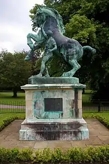 A statue, The Horse and His Master dominates the ‘Malvern Park Avenue’. This powerful statue was sculpted in 1874 by Sir Joseph Edgar Boehm (1834–90) is one of his three large important animal works of the early to mid 1870s. This sculpture is a large version with minor alterations of his 1869 "Cart Horse and Groom" that was exhibited at The Royal Academy in 1869. This version was exhibited at the Royal Academy in 1874 and The Paris Exposition in 1878. These two sculptures show that the splendidly rustic groom dressed in corduroys was replaced by a more scantily clad figure strongly reminiscent of Cousteau's leaders of the Marly Horses located on the Champs Elysees, Paris.[4] It was purchased at auction by Captain Oliver Bird, of Bird's Custard, for his garden at Tudor Grange, but he donated it to the Solihull Council in 1945 and it was finally placed in Malvern Park in the Coronation year, 1953.