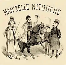 Mam'zelle Nitouche is a vaudeville-opérette in three acts by Hervé. The libretto is by Henri Meilhac and Albert Millaud. This story of a respectable musician, transforming himself into a songwriter at night, is partly inspired by the life of the composer of the piece Hervé, who as Florimond Ronger, his real name, was the organist at the important church of Saint-Eustache, Paris by day and wrote the music for and starred in satirical, irreverent operettas under a stage name at night.[1]