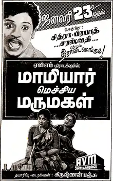 Mamiyar Mechina Marumagal (transl.The Daughter-in law praised by the Mother-in-law) is an Indian Tamil-language film produced by AVM Productions with S. S. Rajendran, M. N. Rajam and G. Varalakshmi starring.[2] The film was released on 23 January 1959.[3] It is a remake of the Marathi film Ganget Ghode Nhahale (1955).[4][5] The film failed at the box office.[6]